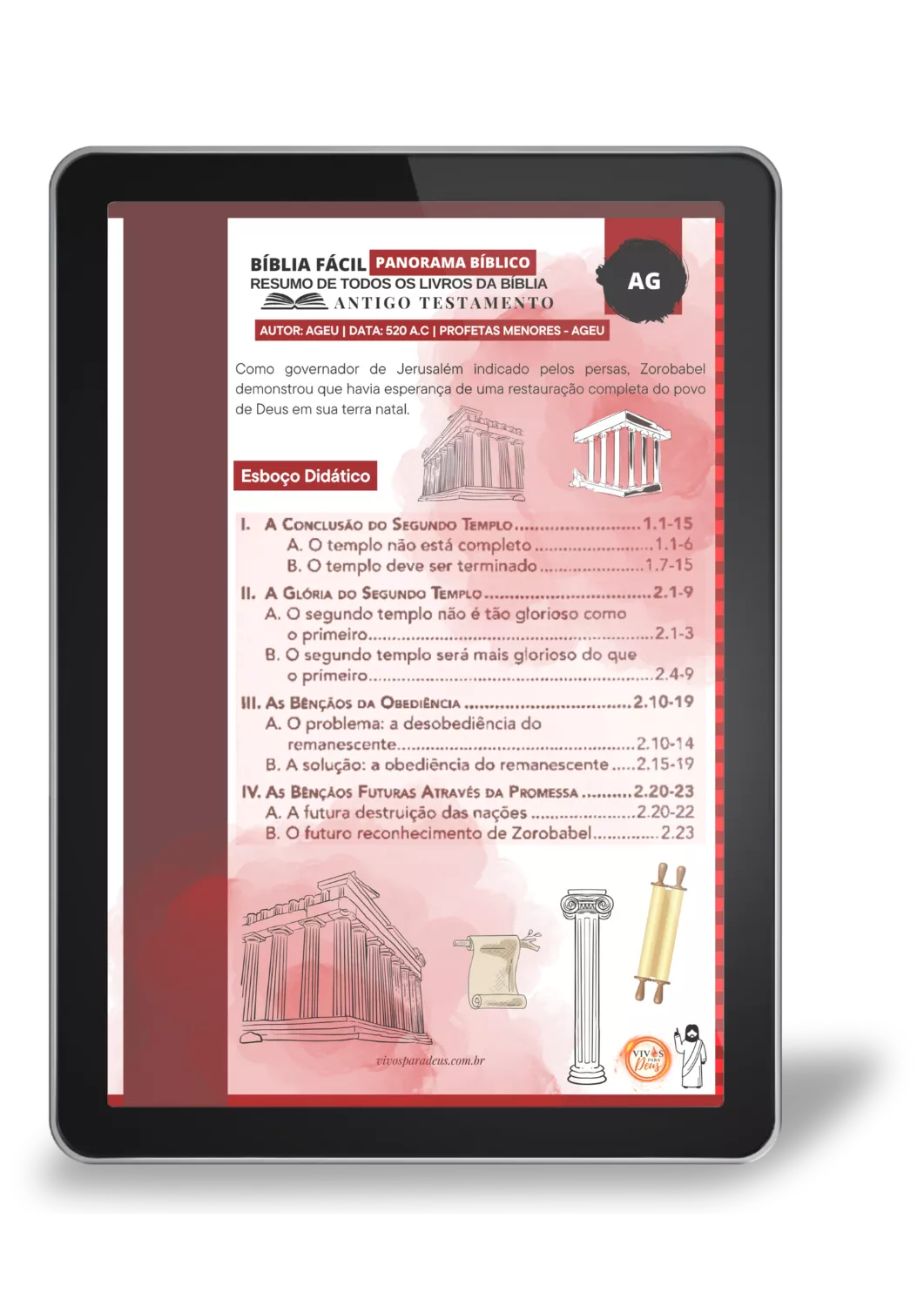 São 102 páginas de conteúdo; Panorama Detalhado, e Esboço Didático livro por livro - Apresentação de cada Livro, Estrutura, Seções, Contexto Histórico, Autoria e Data, Contribuição Teológica, Considerações Especiais, Características Especiais. Estrutura completa da Bíblia - A Bíblia Sagrada, Divisão e Organização da Bíblia, Tema Central da Bíblia, Principais Períodos e Eventos, A Importância da Bíblia, Os Livros da Bíblia, História da Bíblia, Períodos e Épocas.